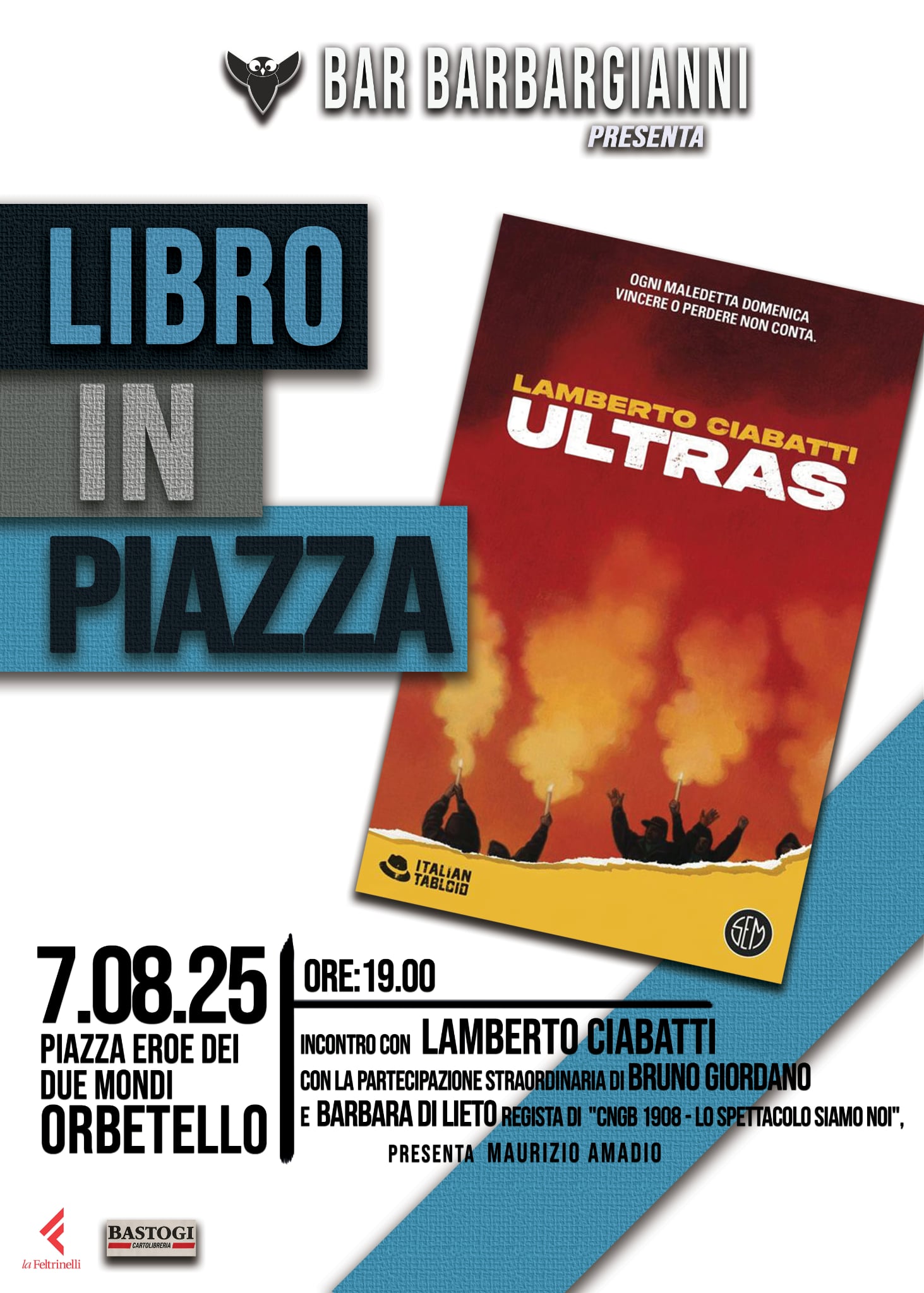 Lamberto Goracci, autore televisivo, presenta il suo libro "Ultras" SEM editore. Intervengono : Bruno Giordano, calciatore, conduttore televisivo, Barbara De Lieto, regista, autrice del documentario "CNGB 1908". Conduce l'incontro Maurizio Amadio, DJ, produttore discografico.